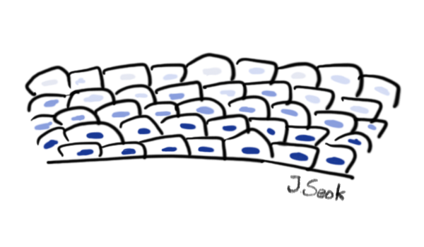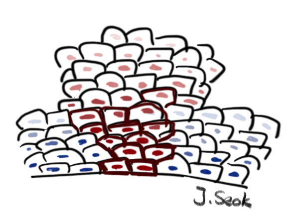 좌측이 정상 점막으로, 아래의 짙은 파란색 점이 재생능력이 있는 세포입니다. 우리의 점막은 피부와 같이 아래에서 세포들이 생성되어 위로 올라가면서 그 능력을 잃어버리면서 탈락되는 양상을 띄게 됩니다. 이 재생능력이 있는 세포에 사람유두종바이러스의 감염이 일어나면 (빨간색) 바이러스 단백질의 영향으로 세포가 과도하게 증식이 일어나면서 사마귀라는 질병이 발생합니다.