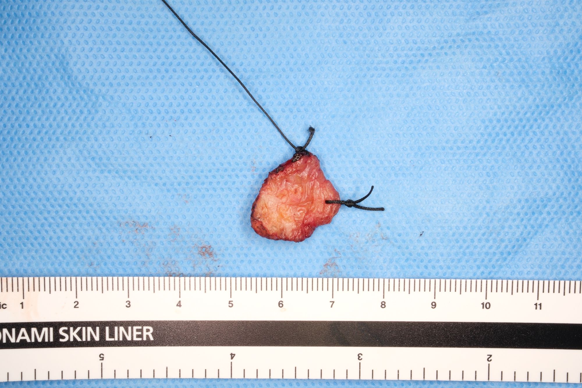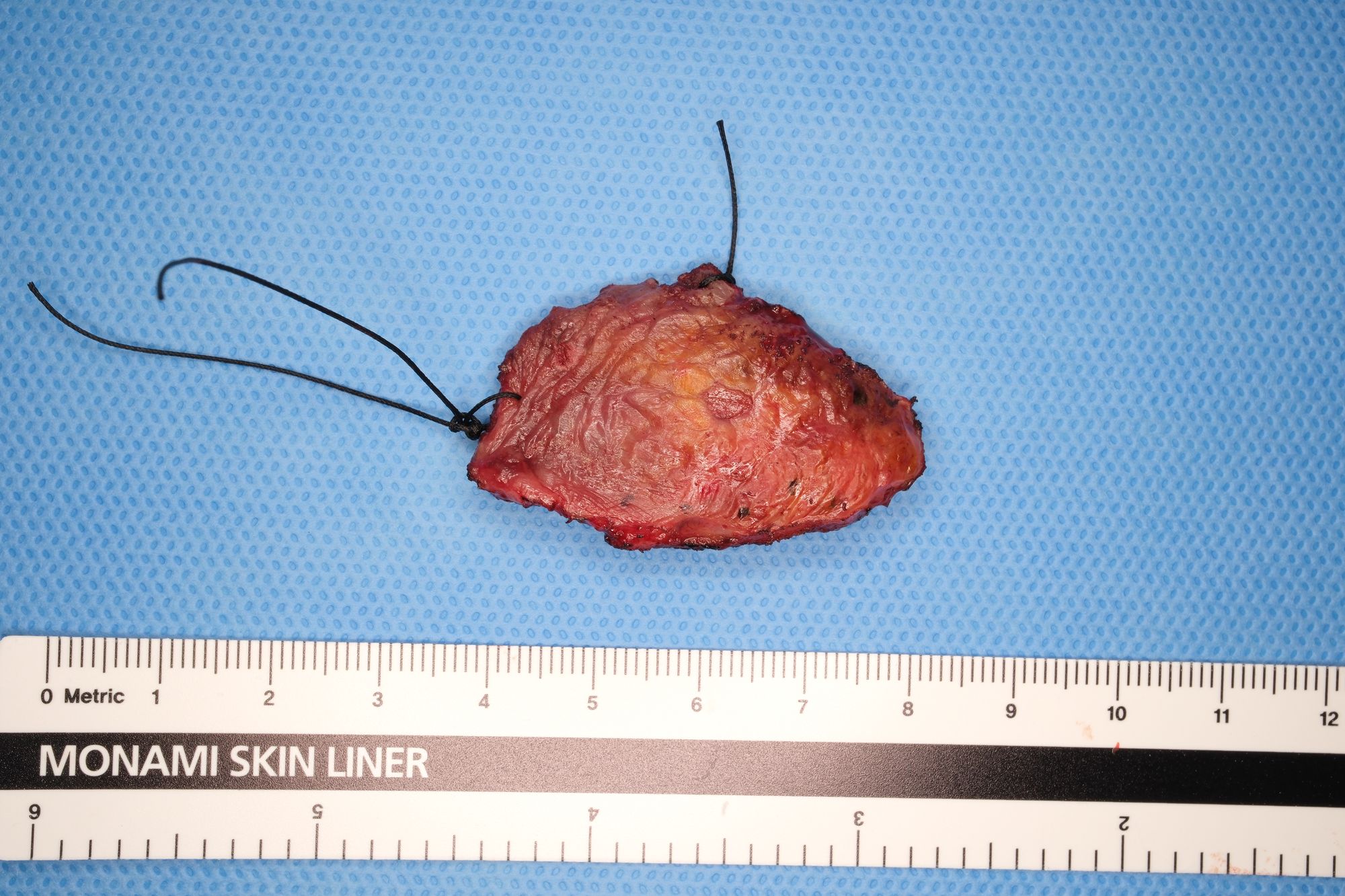 위 환자분은 염색에서 경계가 뚜렷하게 잘 관찰되어 충분히 여유있게 제거하는데 무리가 없었던 경우로, 종양의 두께가 5mm 이상으로, 목의 예방적 임파선 절제술을 시행해야하는 조건에 해당되어 함께 수술을 했던 환자분입니다.